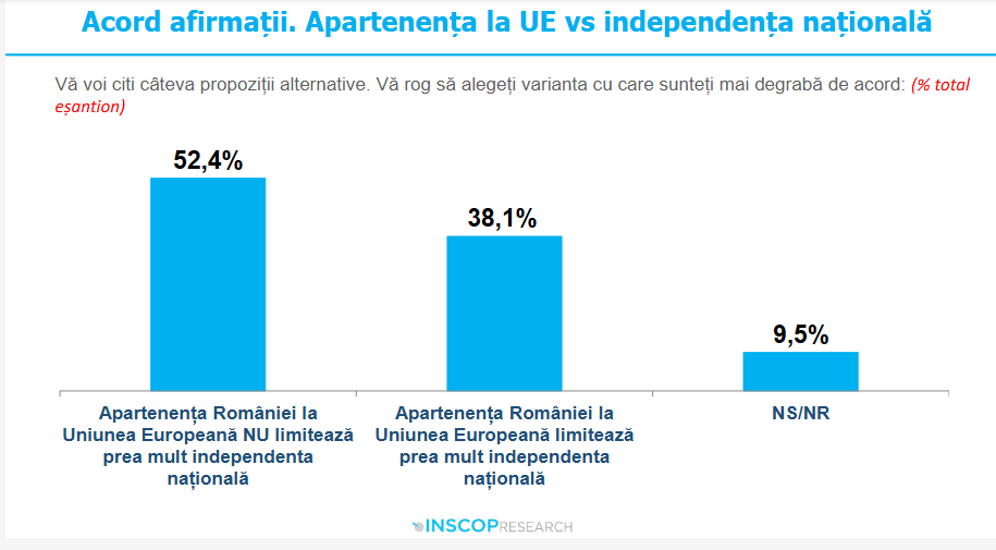 52,4% dintre români sunt de părere că apartenența României la UE nu limitează prea mult independența națională, în timp ce 38,1% dintre participanții la sondaj sunt de părere că apartenența României la UE limitează prea mult independența națională.